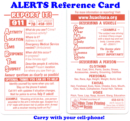 The ALERTS reference card below is business-card sized and designed to carry with your cell phone.
